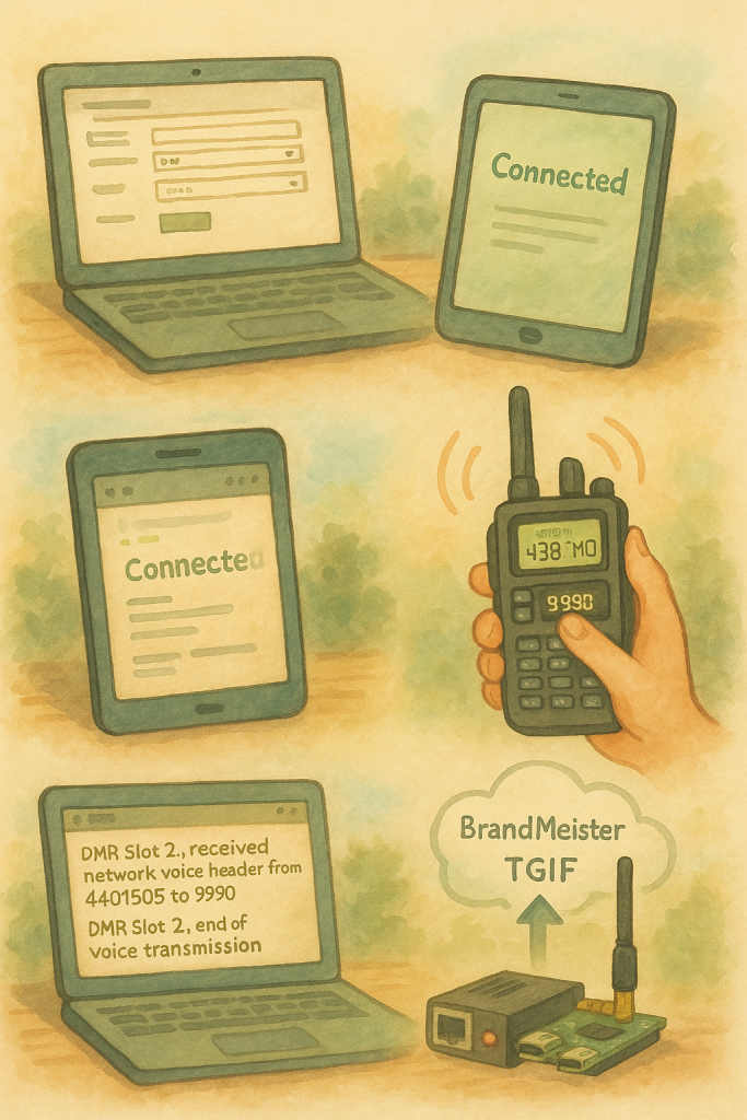 - TX/RX Logs: 無線機からホットスポットへ送信してみて、ログにあなたのDMR IDや送信情報が表示されるか確認します。